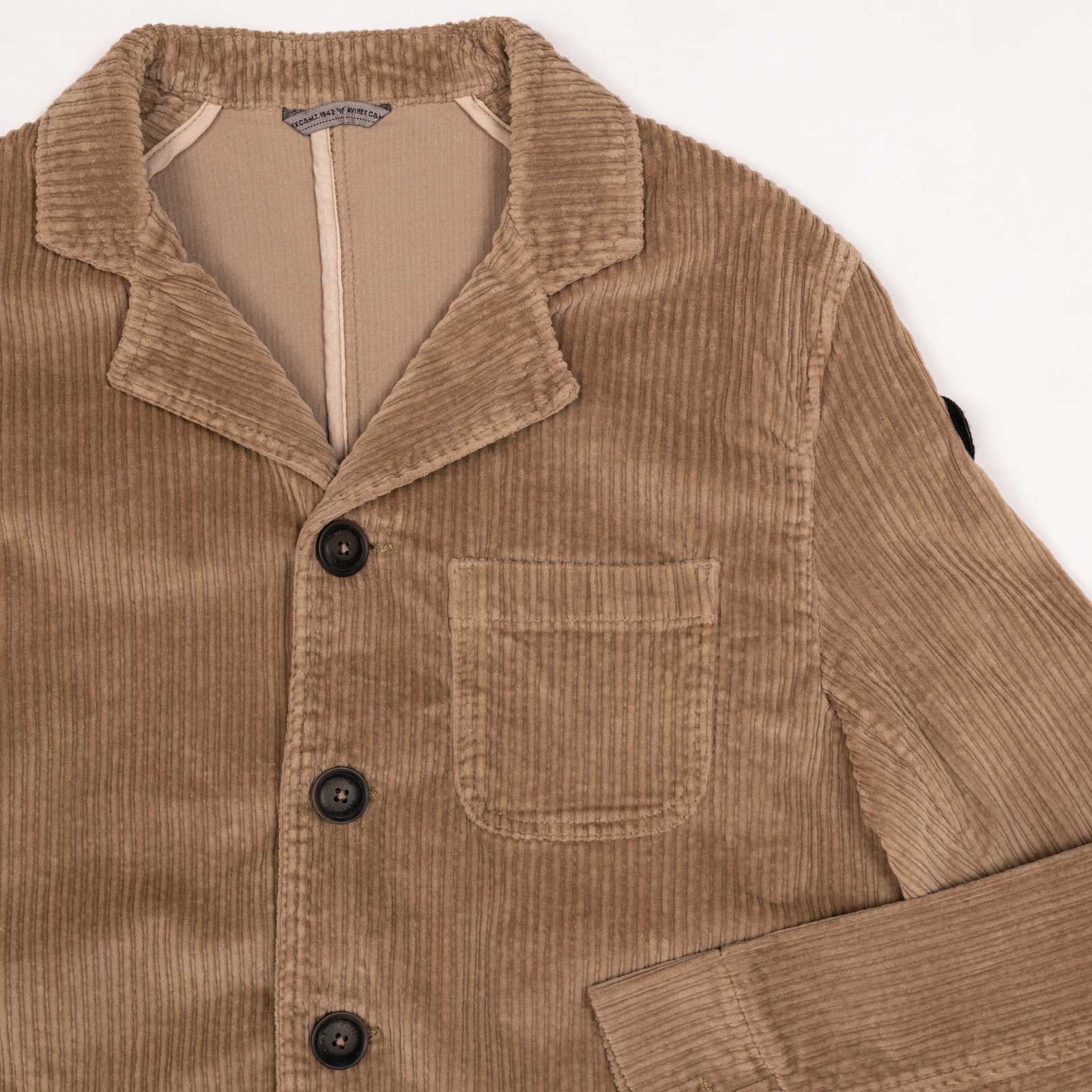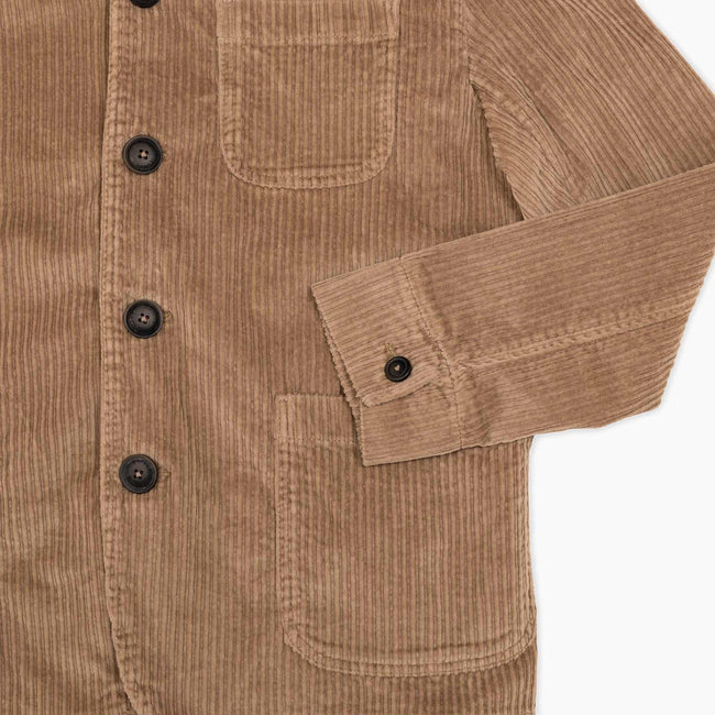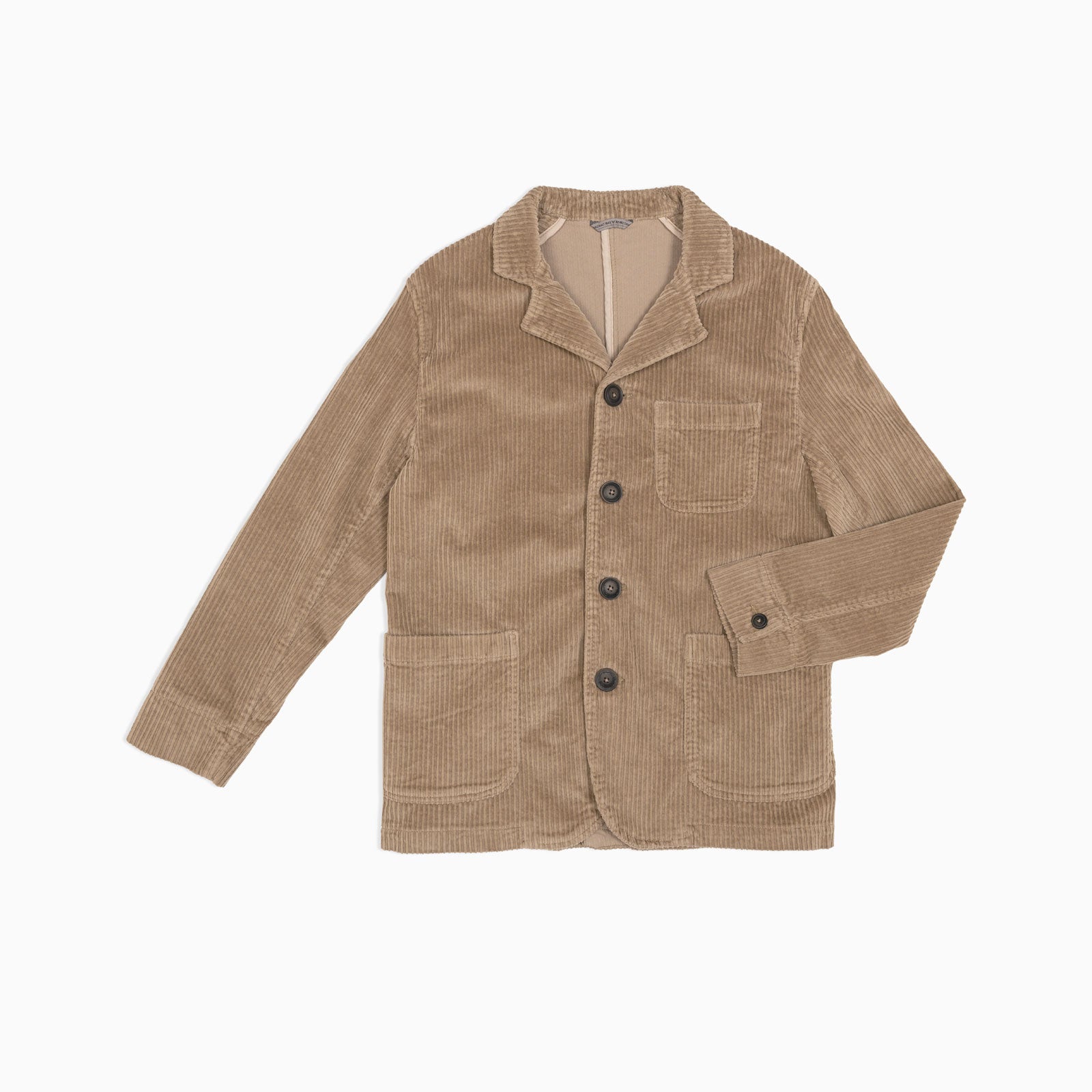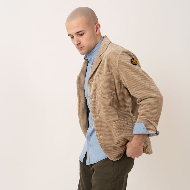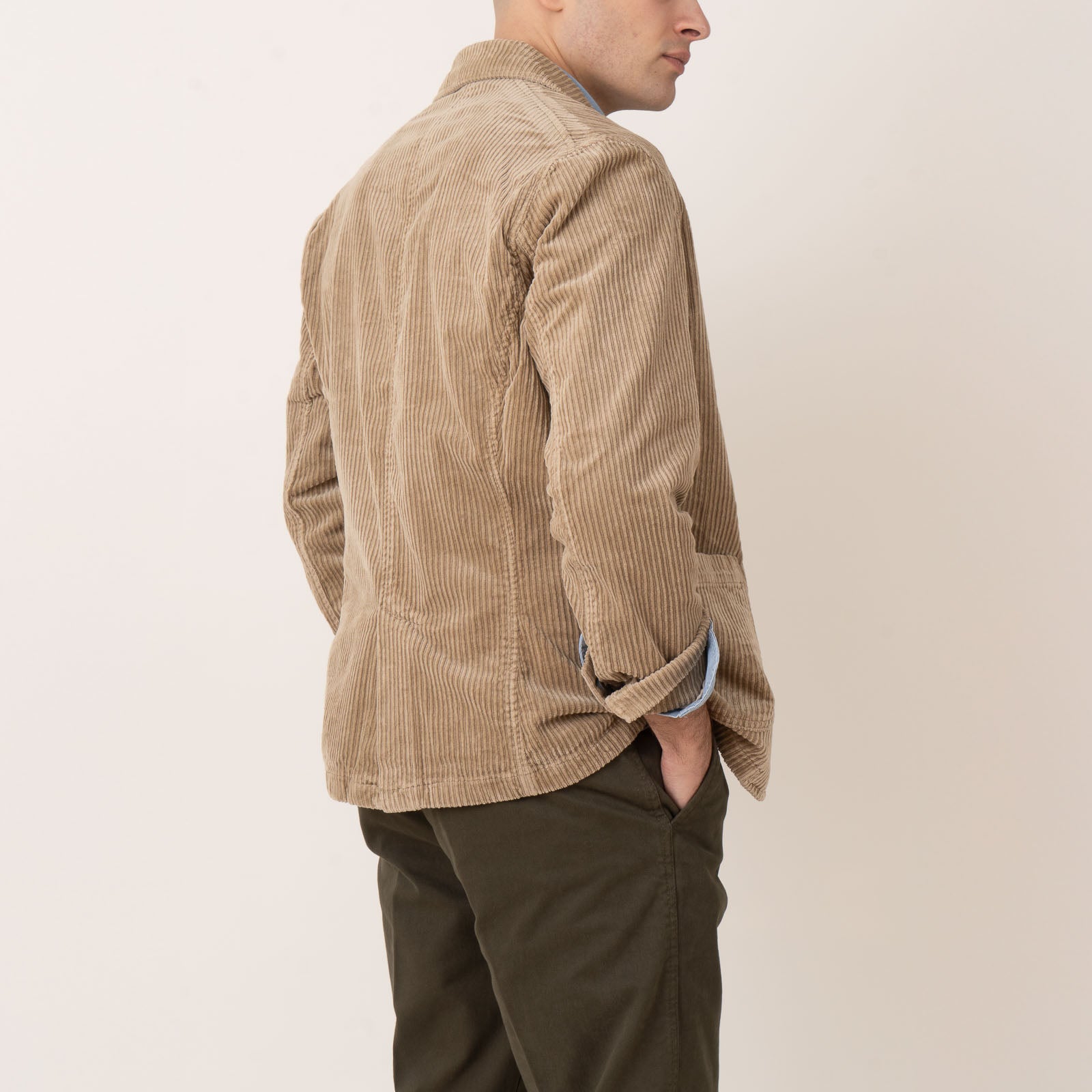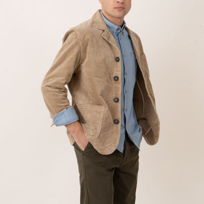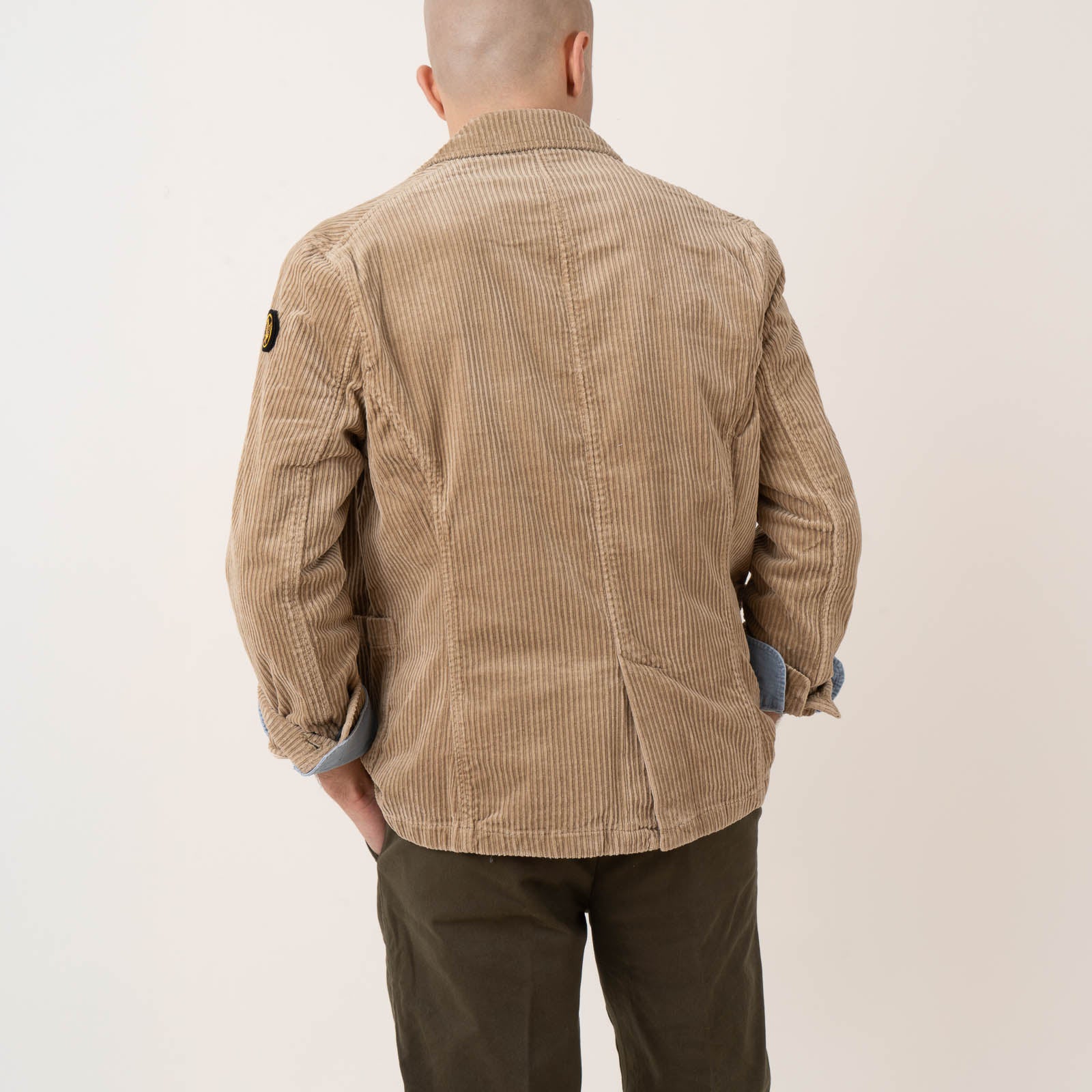 Cotton jacket with lapel collar Button fastening and three front pockets Velcro patch on arm Back vent and adjustable cuffs