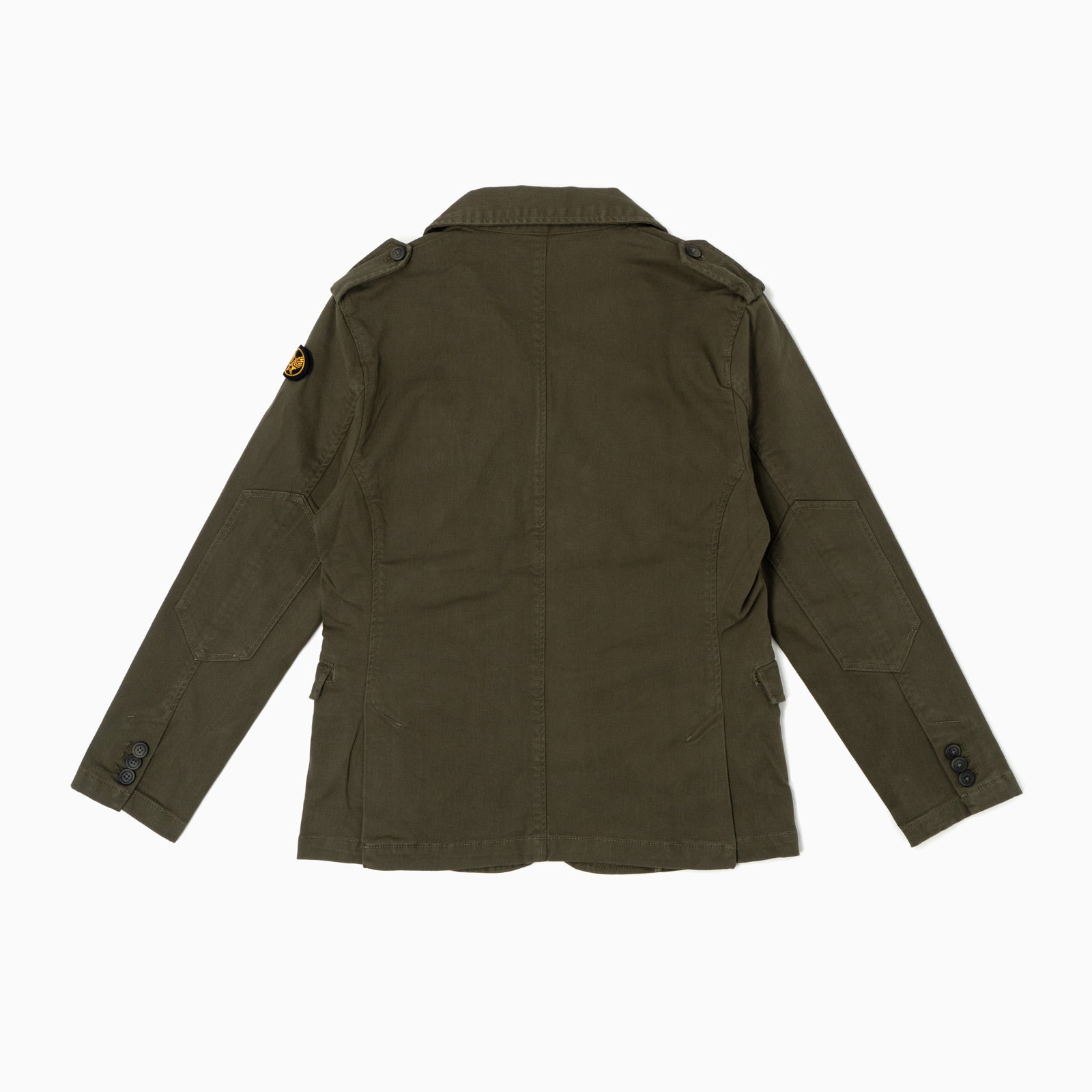 • Structured lapel collar and reinforced shoulder epaulets echo timeless military tailoring