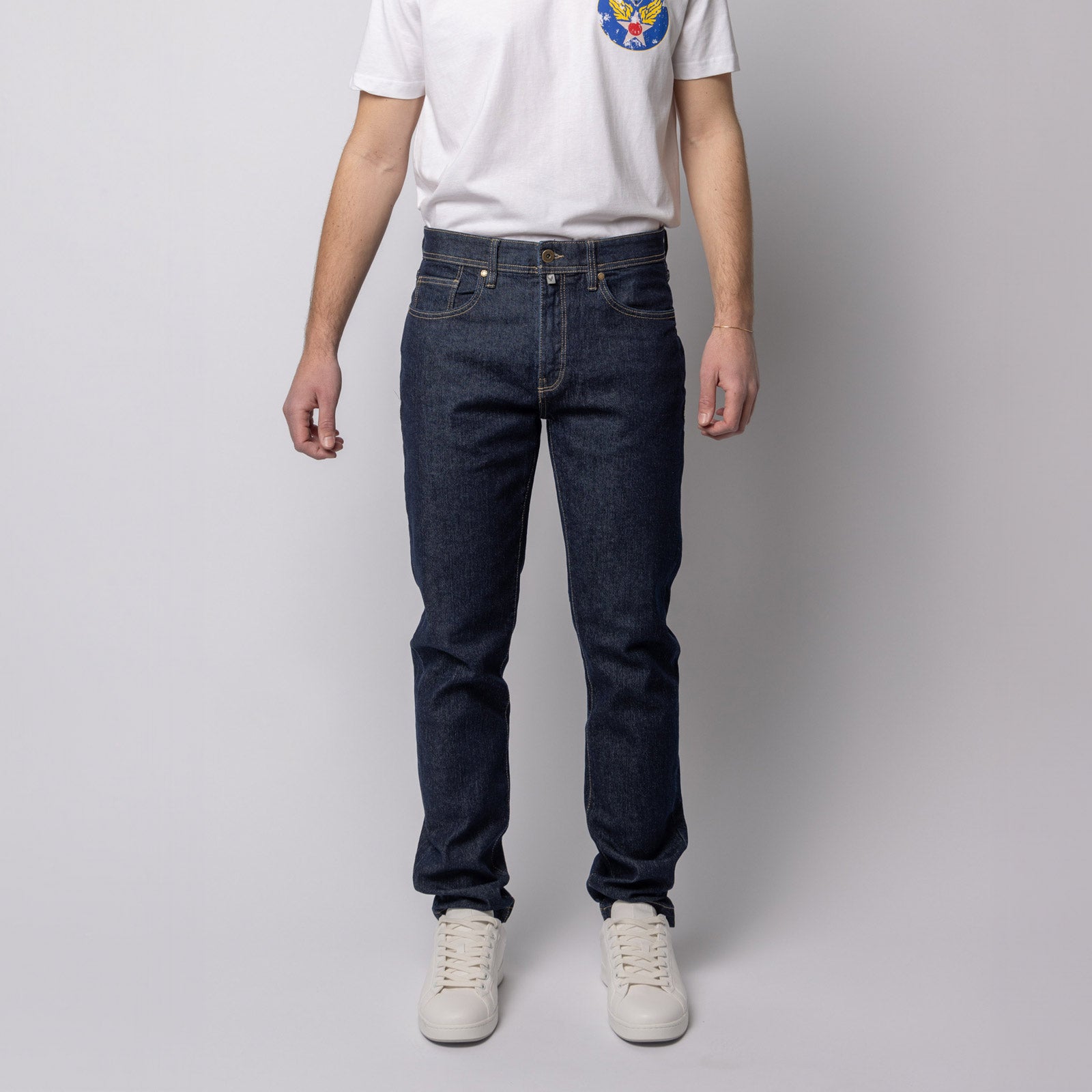 Precious fabric and rich details complete this blue jeans for the greatest come back of the Avirex® Denim.