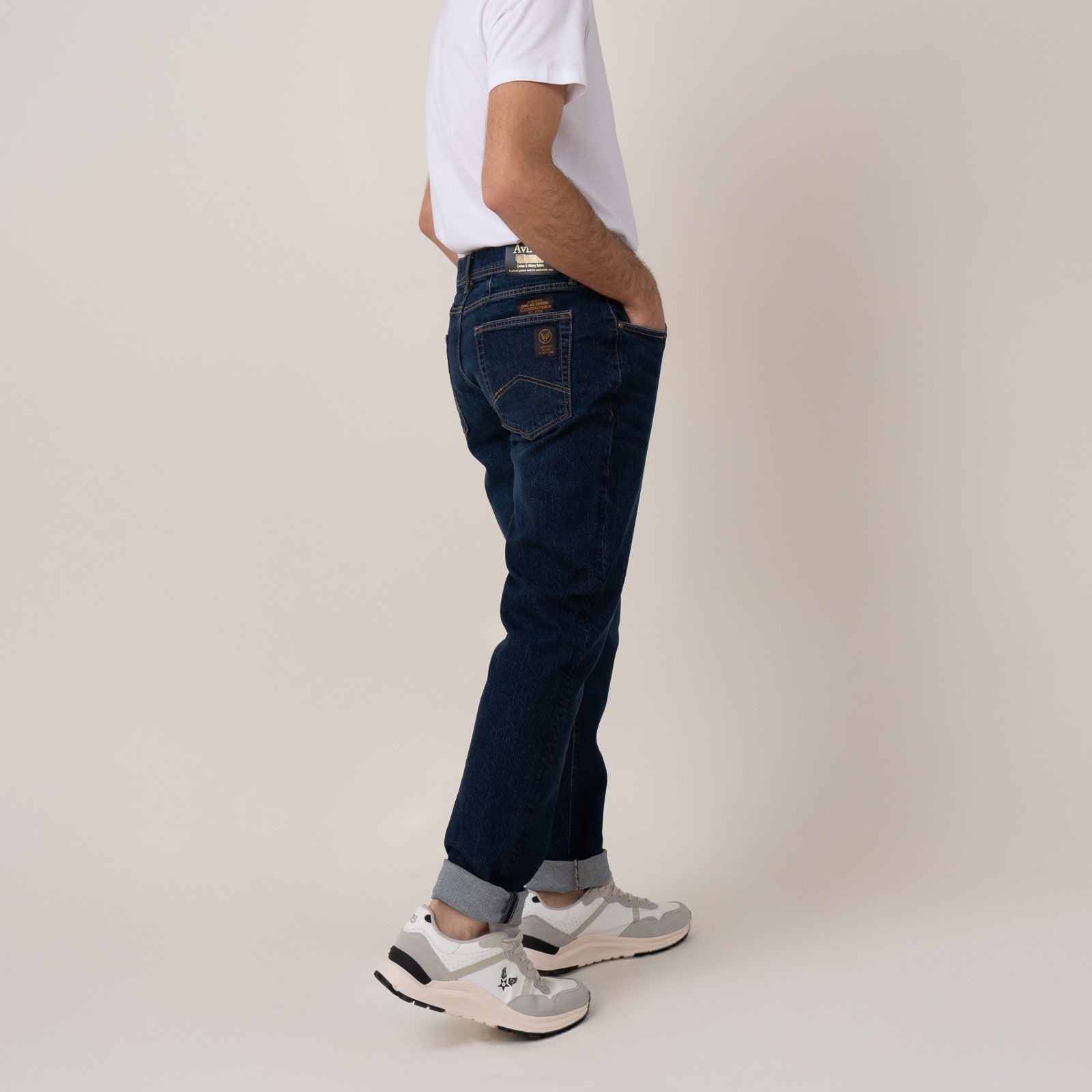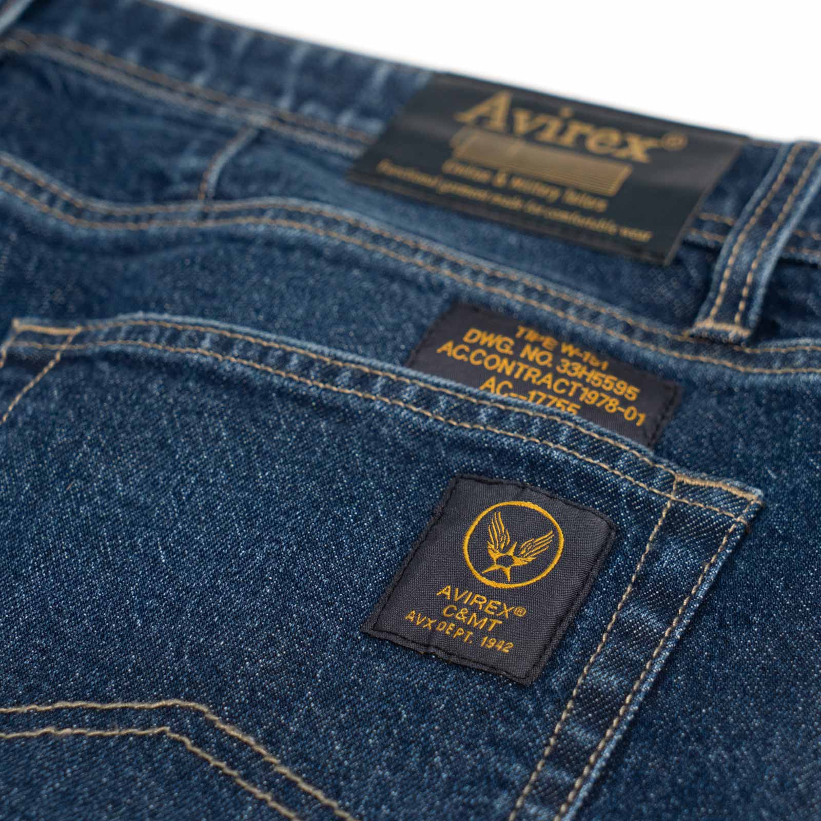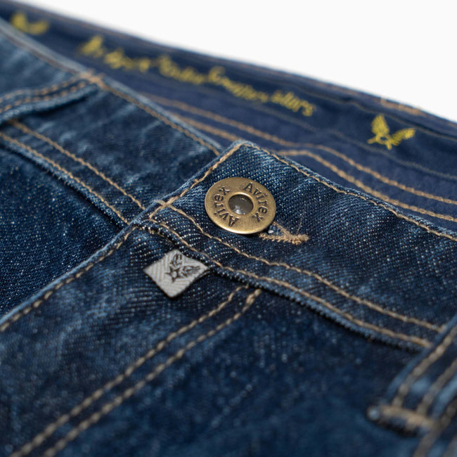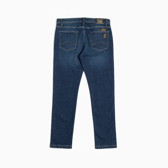 Precious fabric and rich details complete this blue jeans for the greatest come back of the Avirex® Denim.