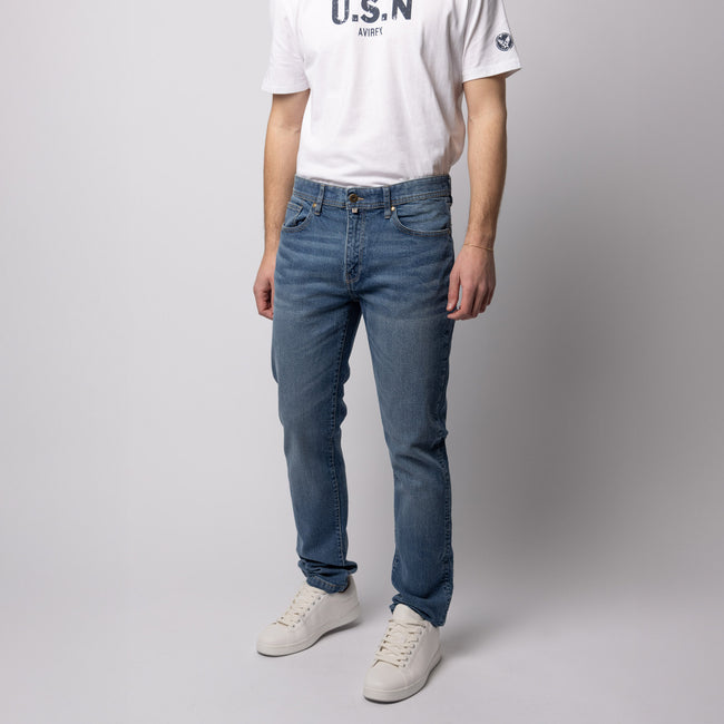 Precious fabric and rich details complete this blue jeans for the greatest come back of the Avirex® Denim.