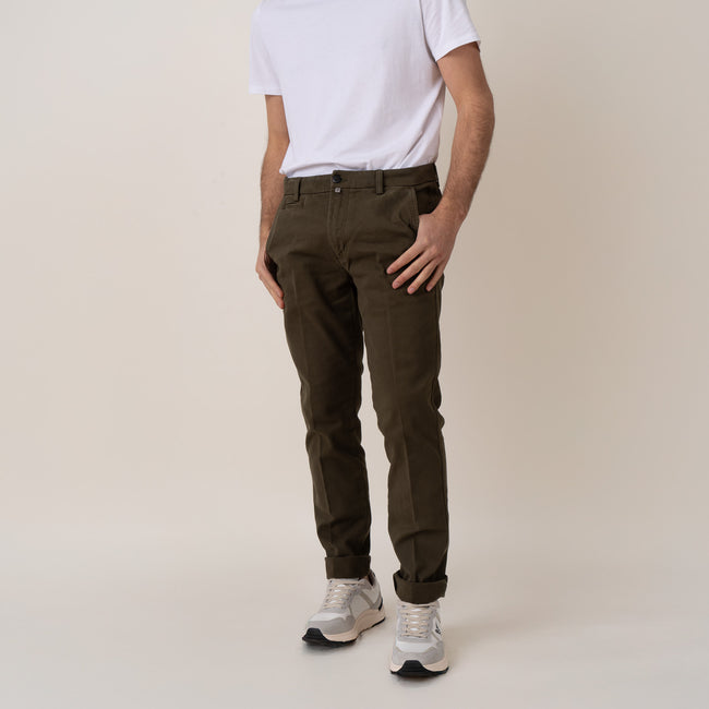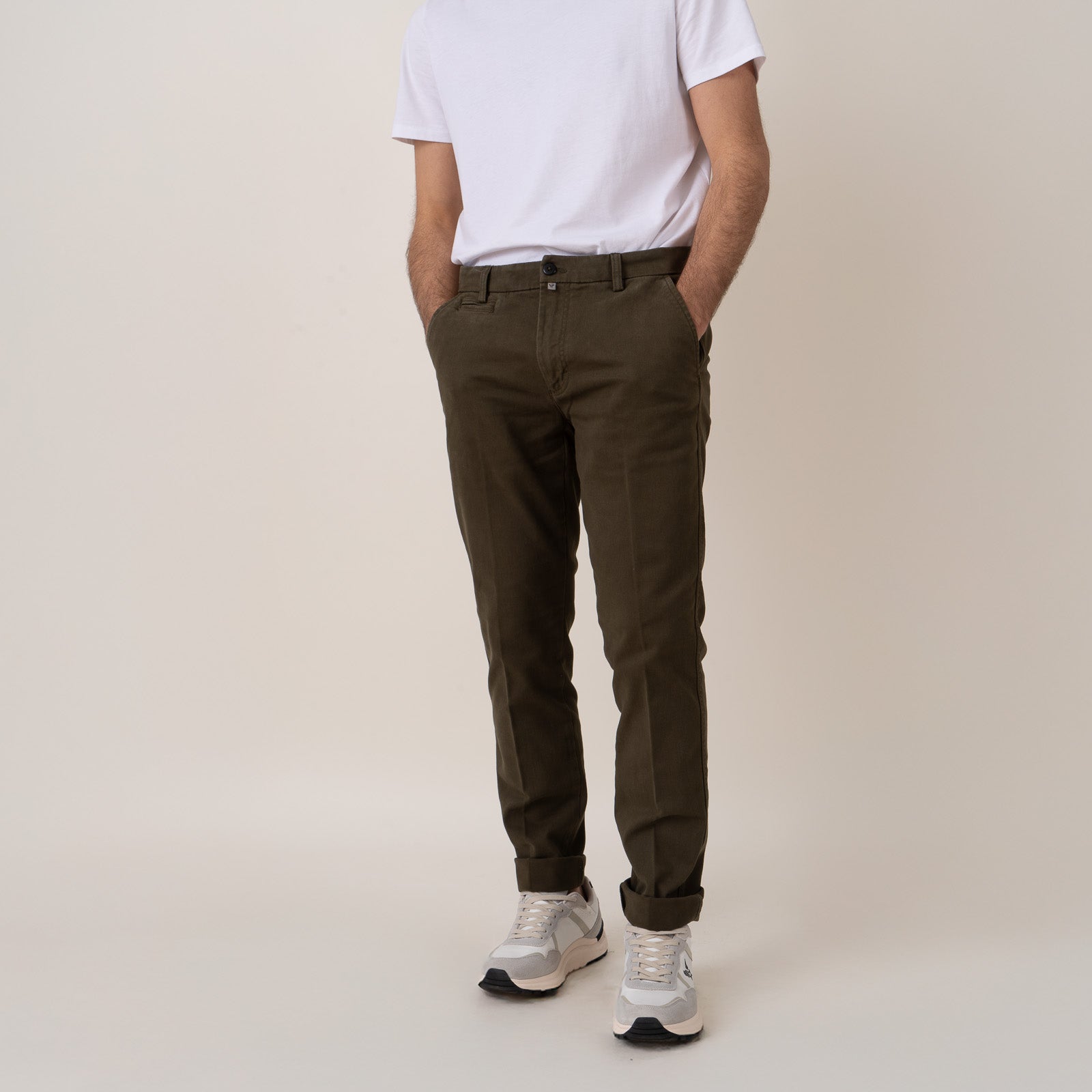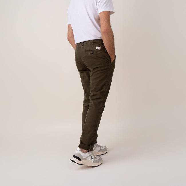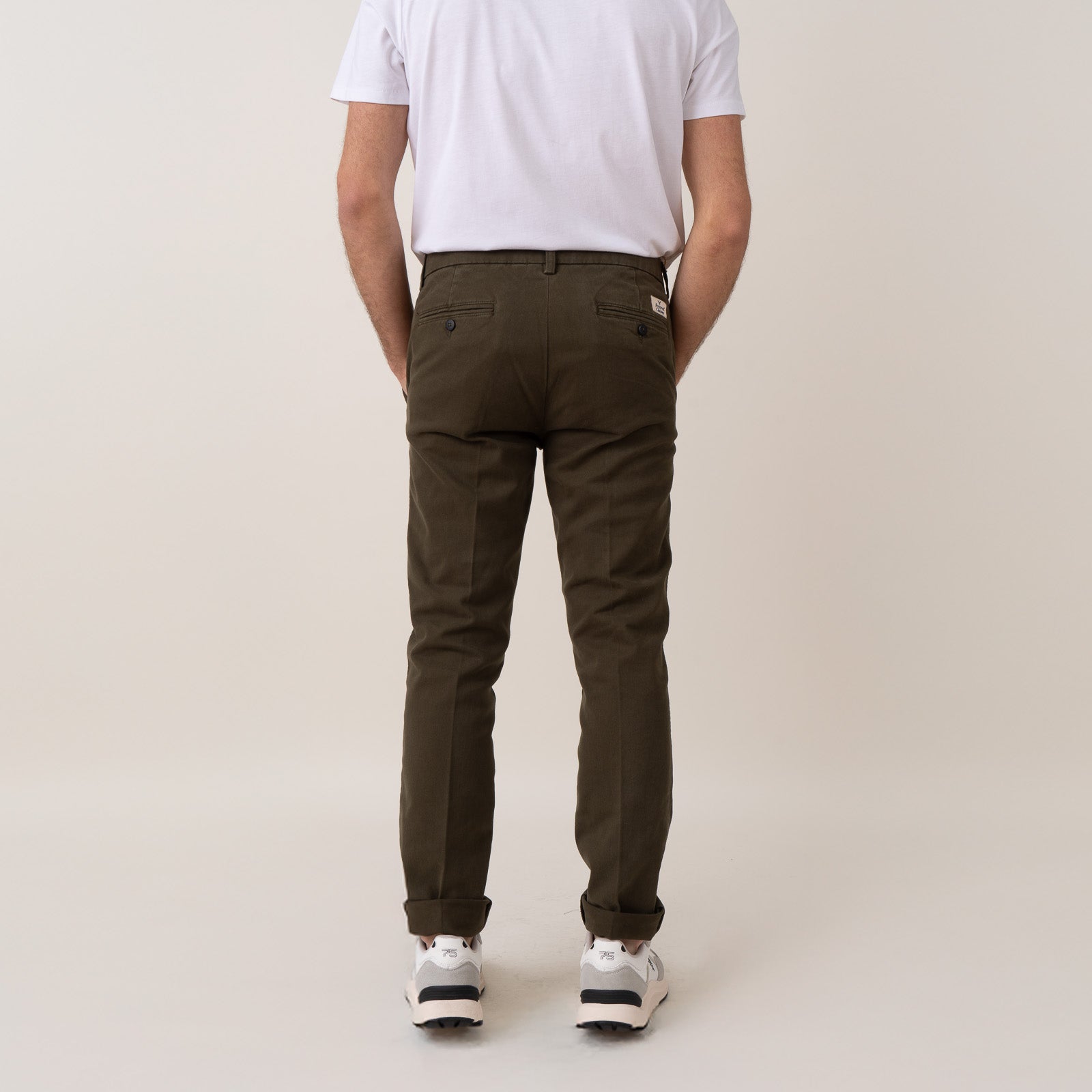 The Chinos pays homage to its military origins through meticulous design elements. The flat front, tailored waistband, and coin pocket on the right side reflect the commitment to classic tailoring and military tradition. These features not only add a touch of authenticity but also contribute to the trousers' functional and stylish characteristics.