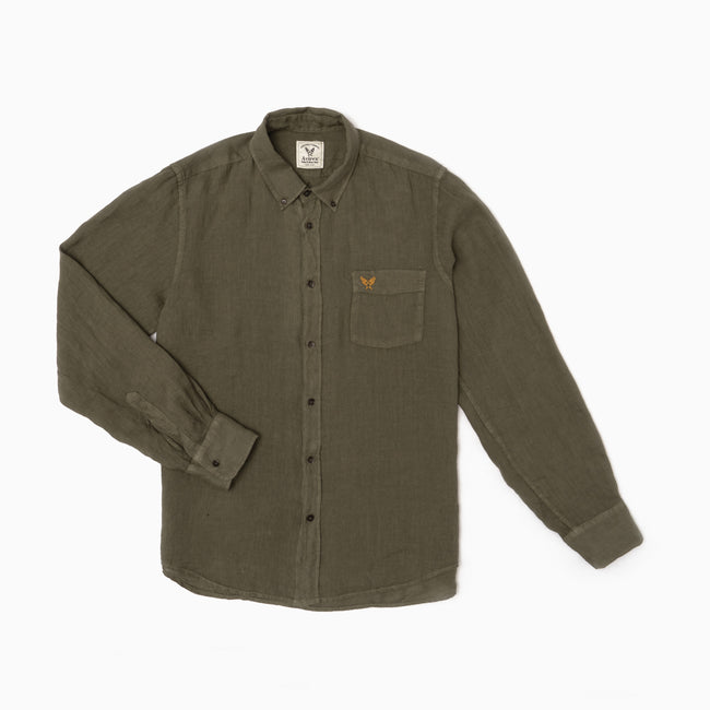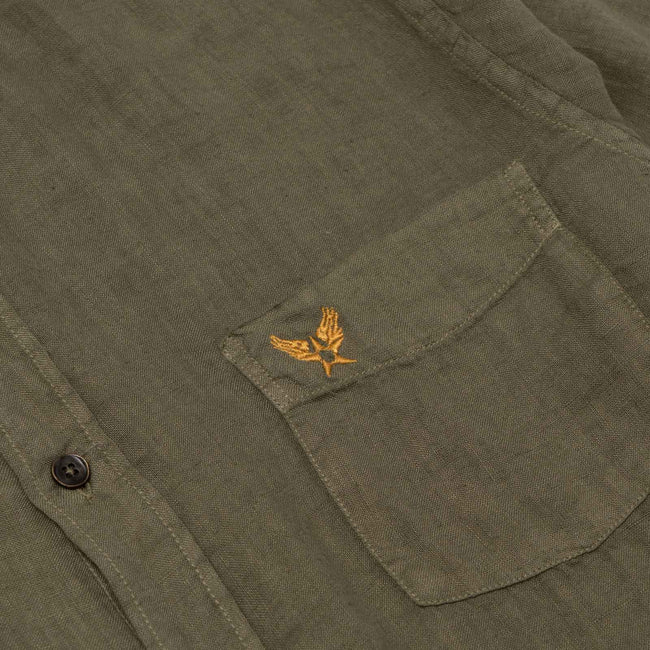 Made in Italy linen shirt, regular fit, military details and embroidered pocket.